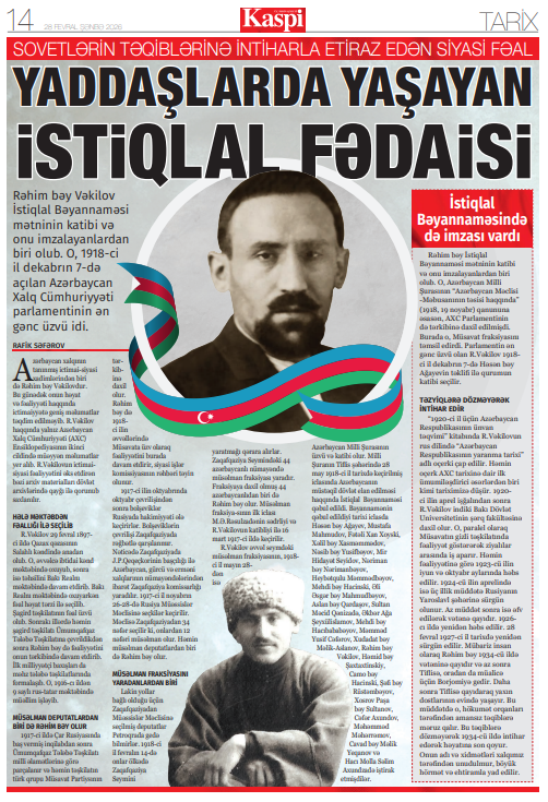 Milli Arxiv İdarəsinin Arxiv sənədlərinin nəşri, istifadəsi və informasiya təminatı şöbəsinin baş məsləhətçisi Rafiq Səfərovun Azərbaycan Xalq Cümhuriyyətinin ictimai və siyasi xadimi Rəhim bəy Vəkilov haqqında arxiv materialları əsasında hazırladığı “Yaddaşlarda yaşayan istiqlal fədaisi” adlı məqaləsi “Kaspi” qəzetinin 28 fevral 2026-cı il tarixli, 08 (4259) sayında, o cümlədən eyniadlı qəzetin elektron resurslarında dərc edilib.
